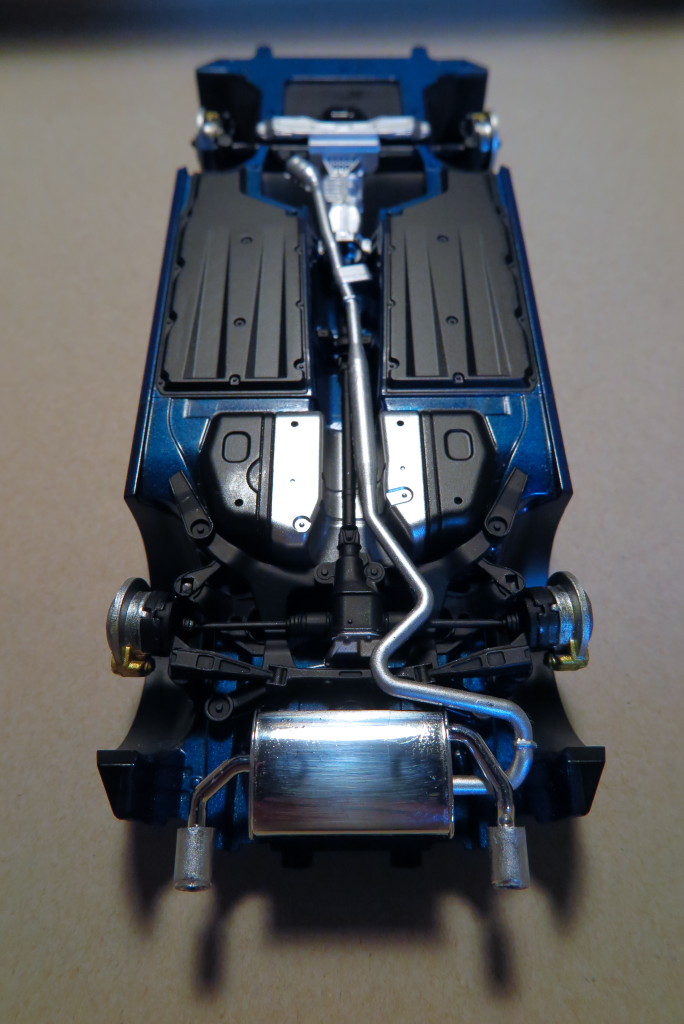 色々と小技を聞かせて自己満足しながら、プロペラシャフト、排気管とマフラー、リアサスメンバー等を組み付けました。