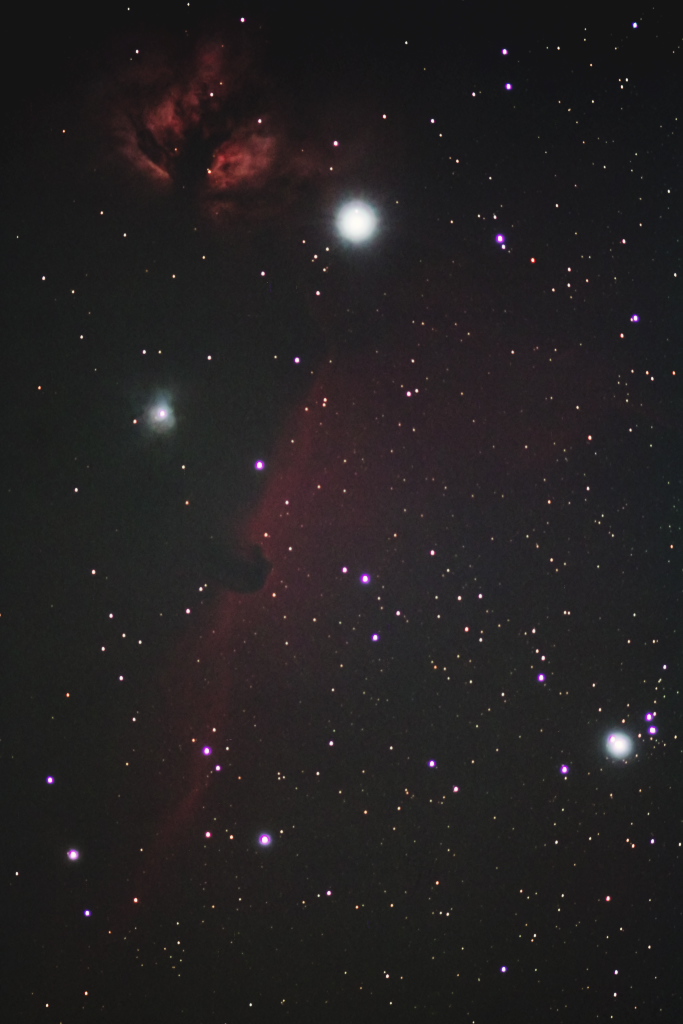 調子に乗って、燃える木と馬頭星雲にも挑戦。さすがに暗くてノイズが多く何とか見える程度にしかなりませんでした。これ以上は光害を避けて更に暗い所に行ったり、ダークやフラットなどの画像処理を行う必要がありそうです。