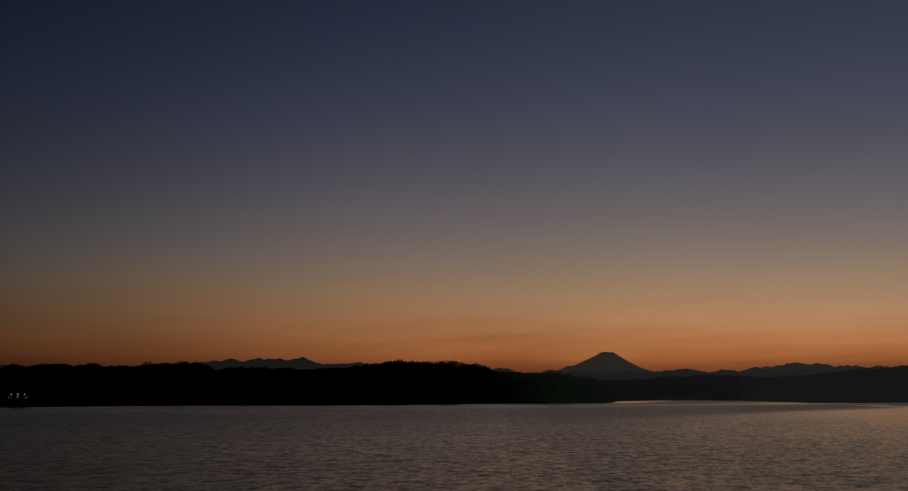 時間が経ってマジックアワーになりつつあるところ。パノラマ仕立てにしました。風のせいか逆さ富士は見えなくなってしまいました。