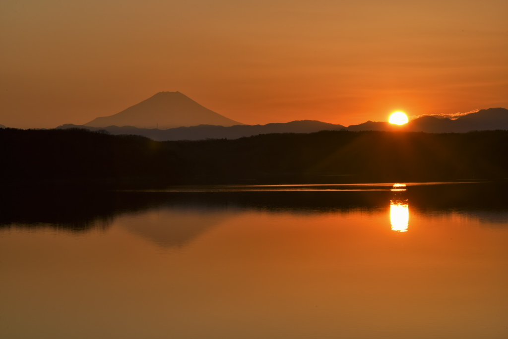 ちょうど沈みかかった太陽が湖面にも映り、逆さ富士と一緒に撮れました。