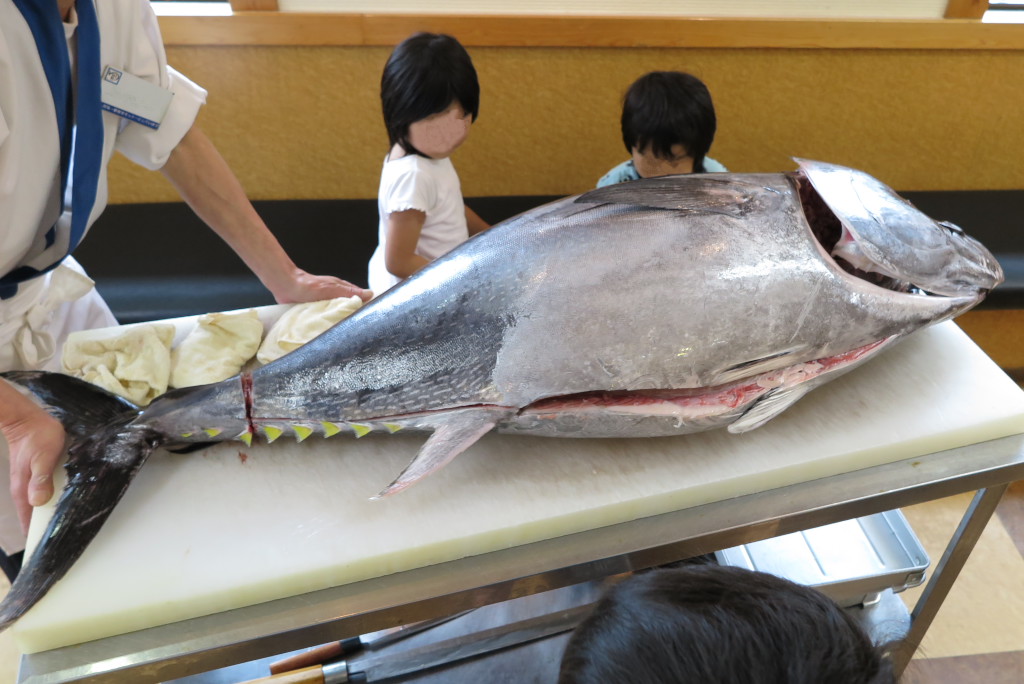 今日はマグロの解体ショーをみながら昼食をとりました。