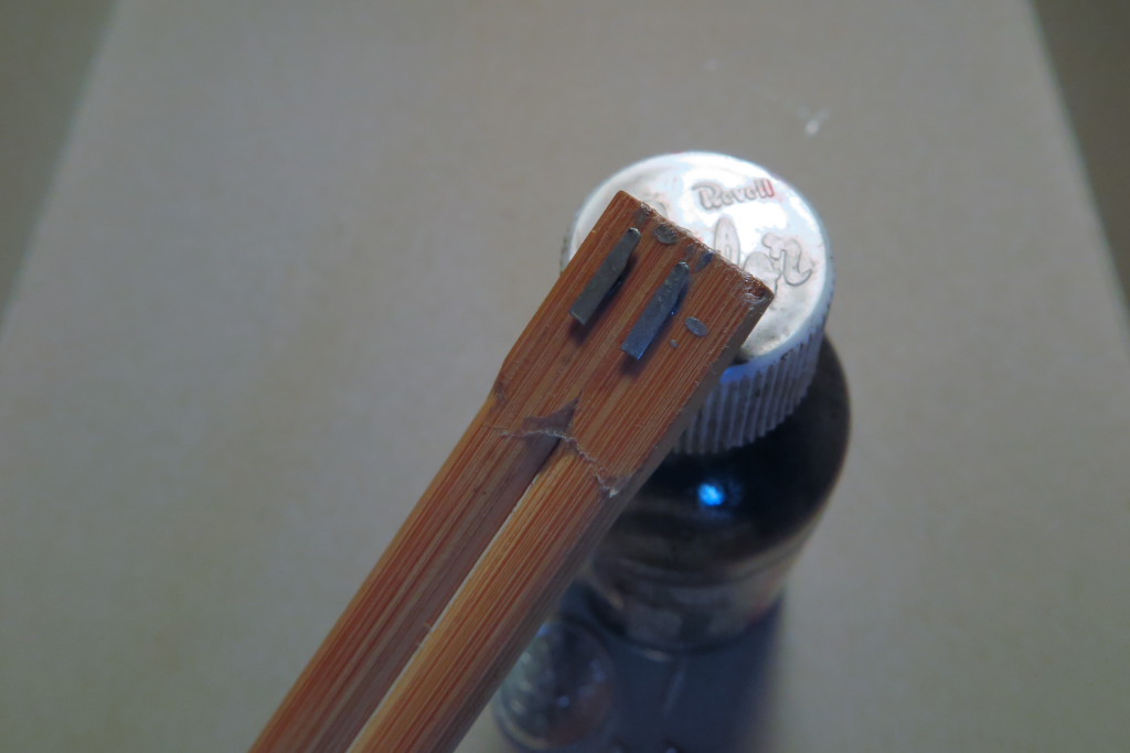 前夜に接着して固定していた部品ですが、力が強すぎたせいか変形して壊れてしまいました。右の部品が2つに分離してしまいました。真ん中は変形してしまい、もはや修理不可能状態でした。左右セットが必要なので、やむなく透明のランナーで似た様な形のモノを流用する事に・・・ 左の2つになります。何とか流用できるランナーがあってほっとしました。