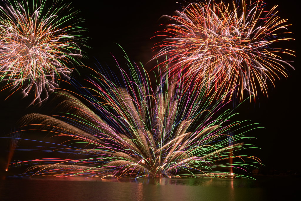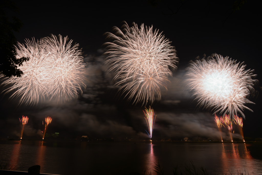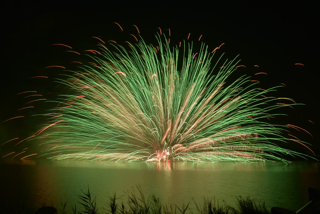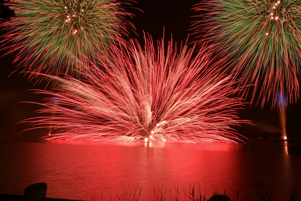 連日猛暑が続く中、場所確保の為に早めに行って構えていた甲斐がありました。恐らく、ここでしか見る事のできない水中スターマインが湖面に反射する光景を堪能できました。