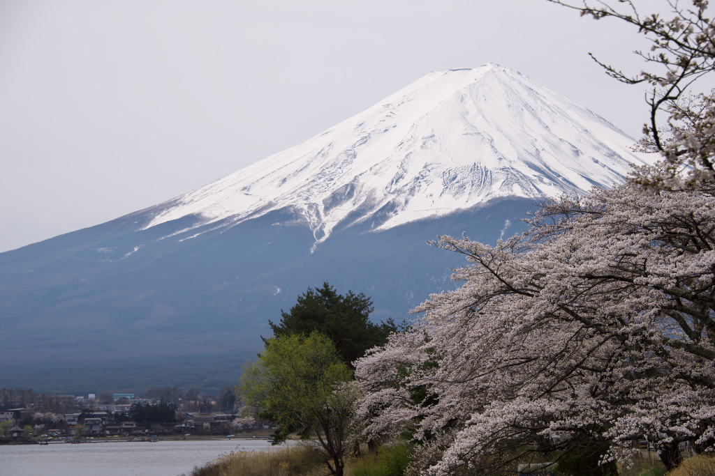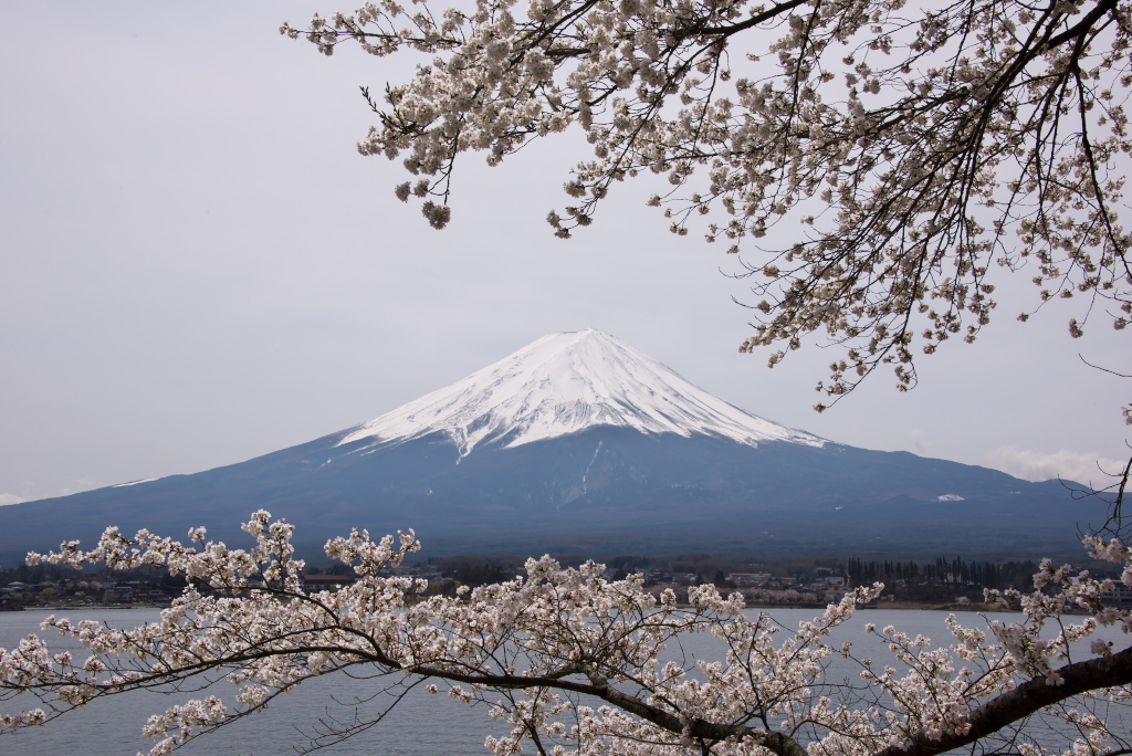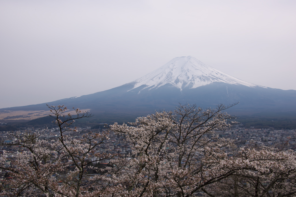 河口湖の北湖畔から。青空でないのは残念ですが、富士山と桜を絡めて撮りたかったのに対してイメージ通りに撮れたので満足です。
