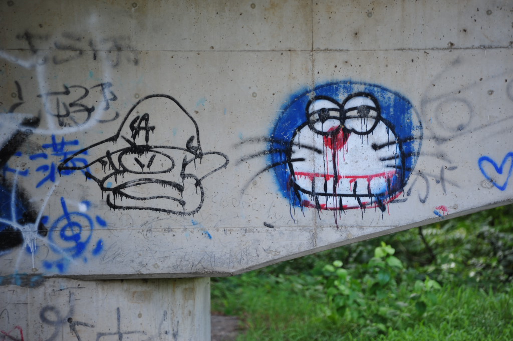 橋桁のセンス溢れる落書き。ペンキのタレ具合が気味悪い銅鑼絵門です。