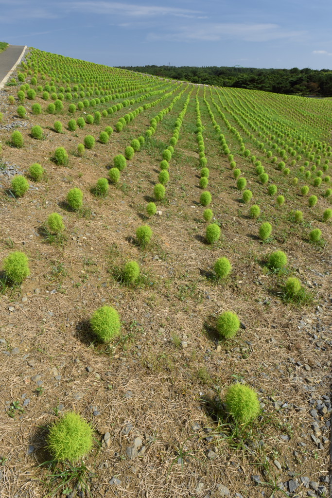 おそらく植えられたばかりのコキア。これから大きく赤くなっていくと思いますが、緑色で小ぶりなのもかわいいです。