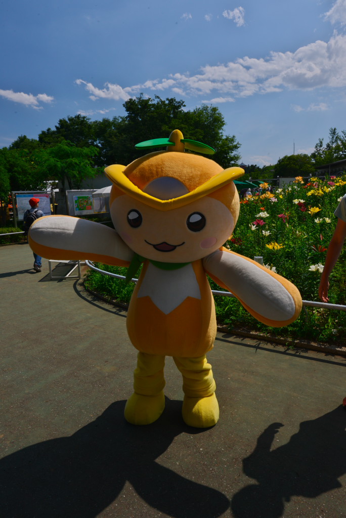 所沢市のマスコット”トコろん” ほとんど見えないらしく、付き添いの人の案内で動いていました。おまけに、この天気では暑くて中の人も大変そう。