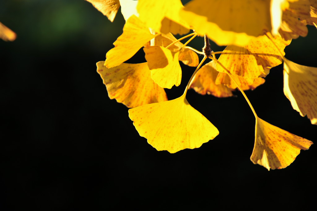 イチョウの葉を透過光と黒っぽい背景で。
