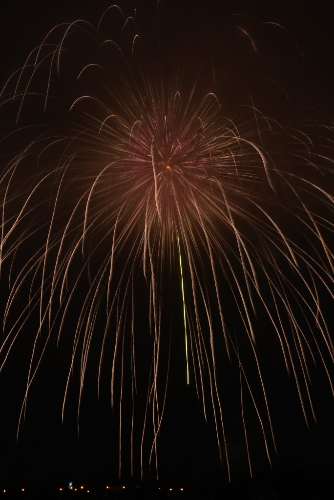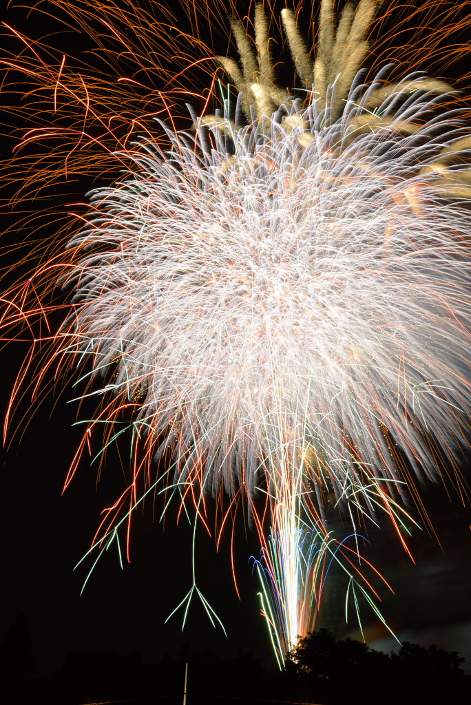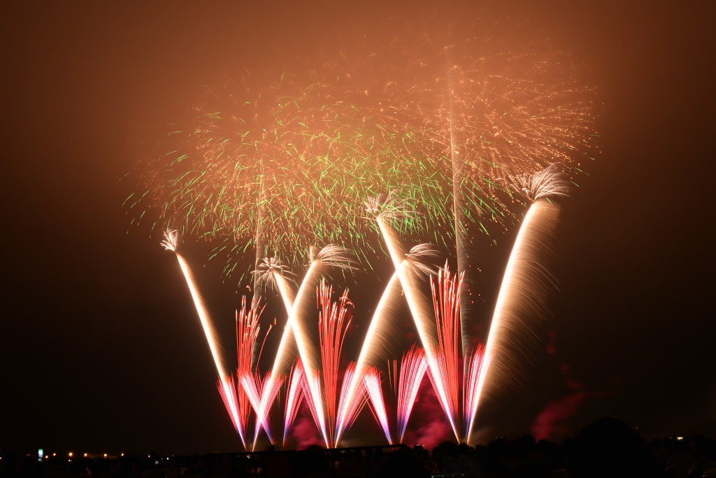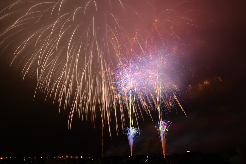 花火は良かったのですが、椅子席が詰め込みすぎで一度座ると前後左右とも身動きが取れず、三脚も開けず、大会運営としてはイマイチでした。次年度以降の改善に期待です。2台のカメラがセッティングできなかったのでVideoから比較明で合成した1枚だけupします。構図としては狙い通りの画にはなりましたが、露出オーバーになってしまいました。