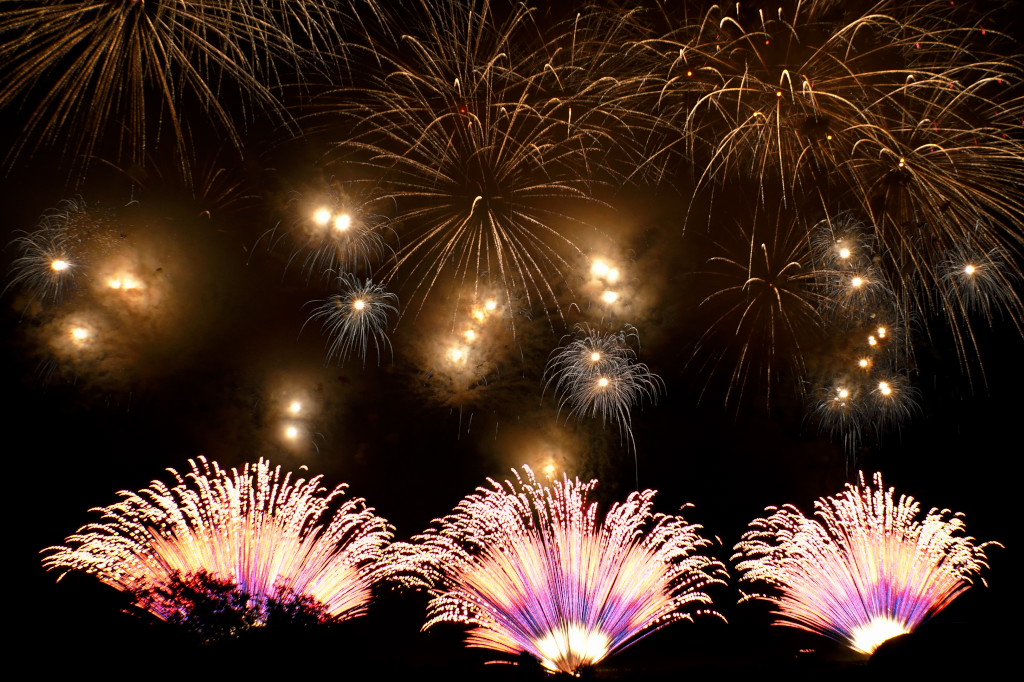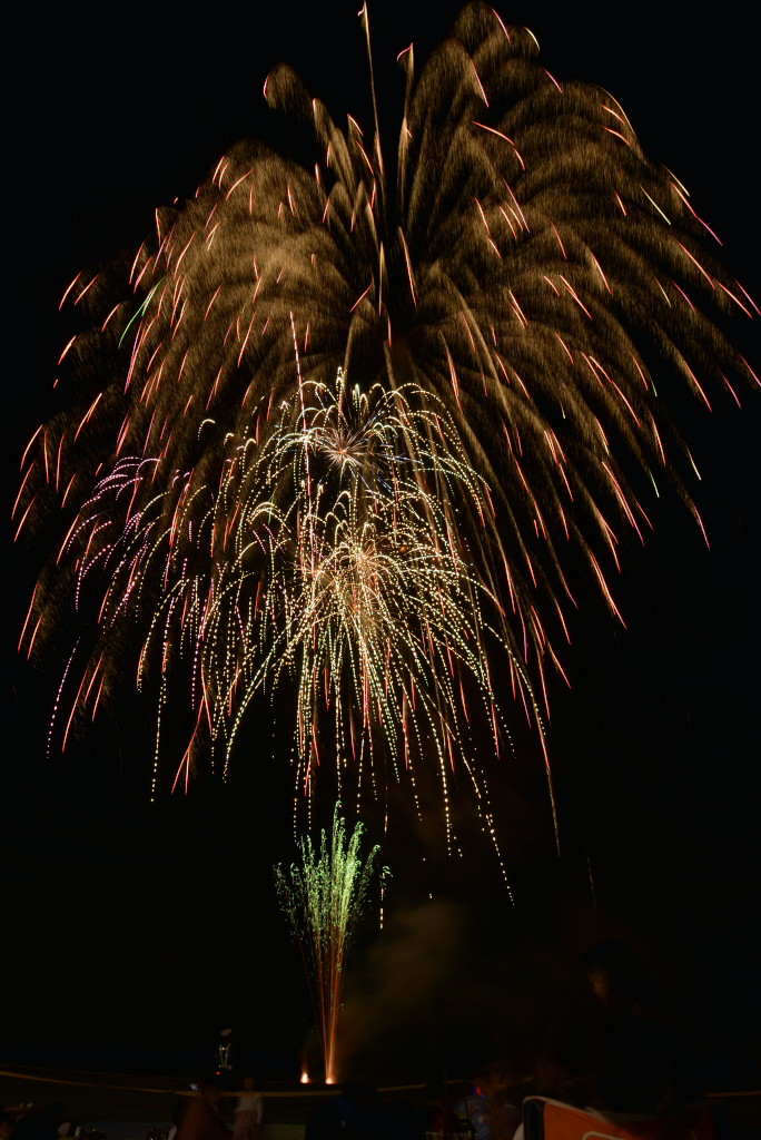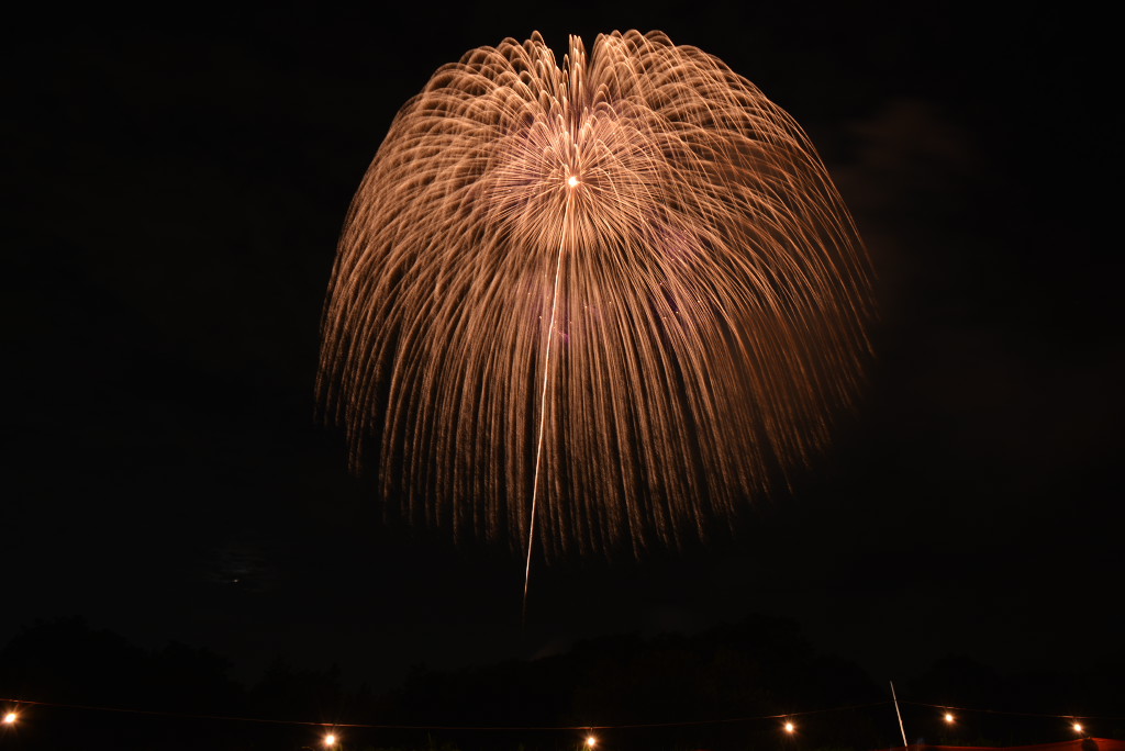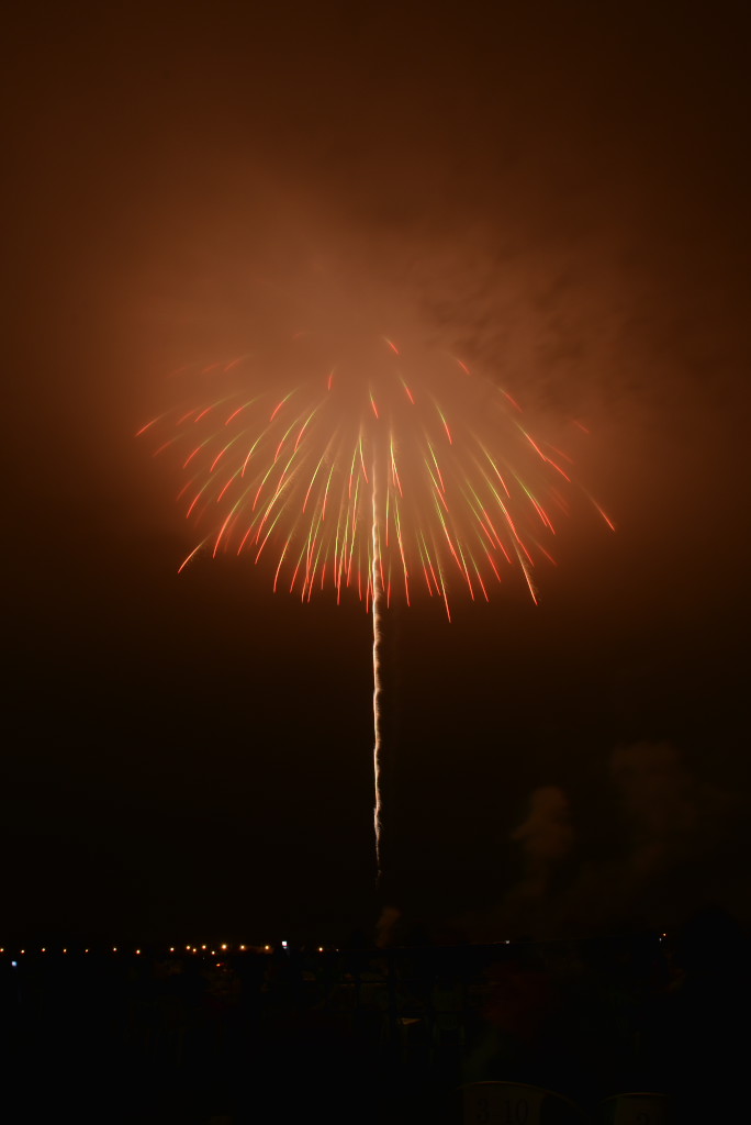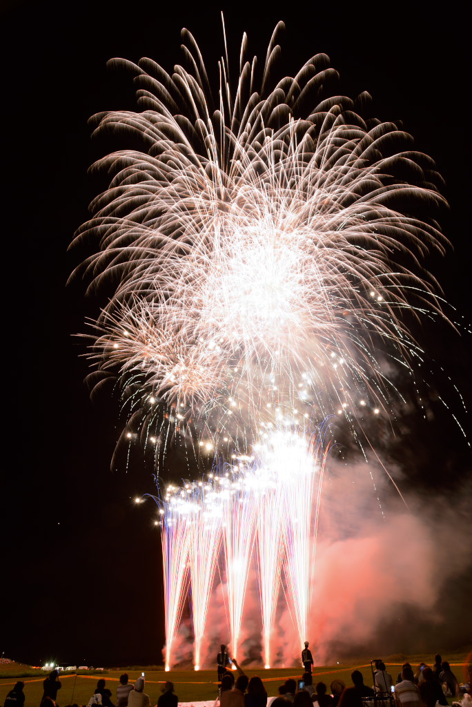花火は良かったのですが、椅子席が詰め込みすぎで一度座ると前後左右とも身動きが取れず、三脚も開けず、大会運営としてはイマイチでした。次年度以降の改善に期待です。2台のカメラがセッティングできなかったのでVideoから比較明で合成した1枚だけupします。構図としては狙い通りの画にはなりましたが、露出オーバーになってしまいました。