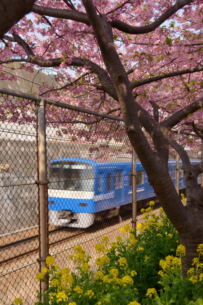 線路沿いは下に菜の花、上には桜が続いて絶景ですが、金網が邪魔で撮り鉄には程遠い一枚です。(^^;;