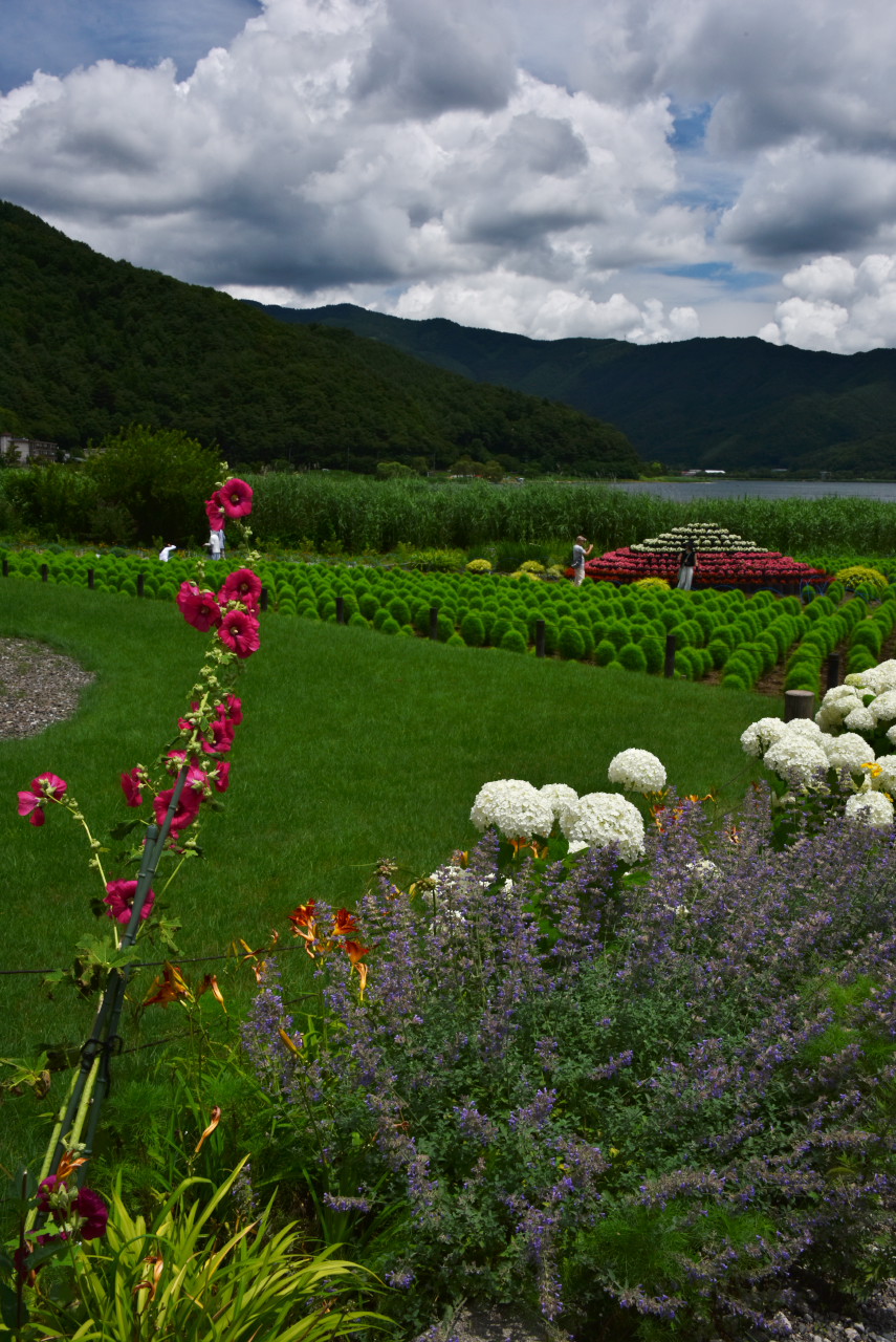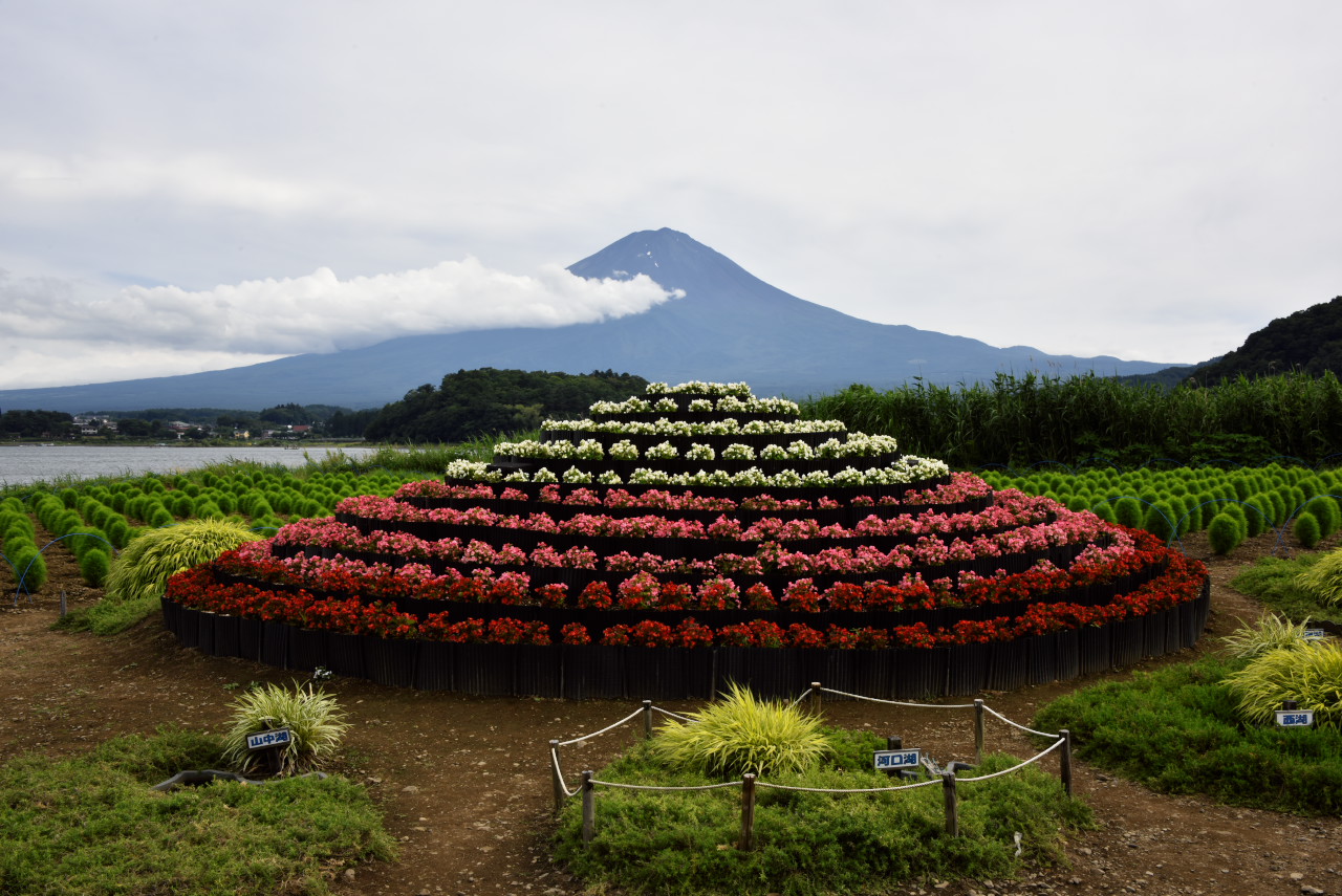 出口近くへ戻った所でミニ富士山とセットにしました。富士五湖を模したプランターも配置されています。”山”同士がある程度重なる様に、また後ろのコキアのバランスを考えて撮ってみました。