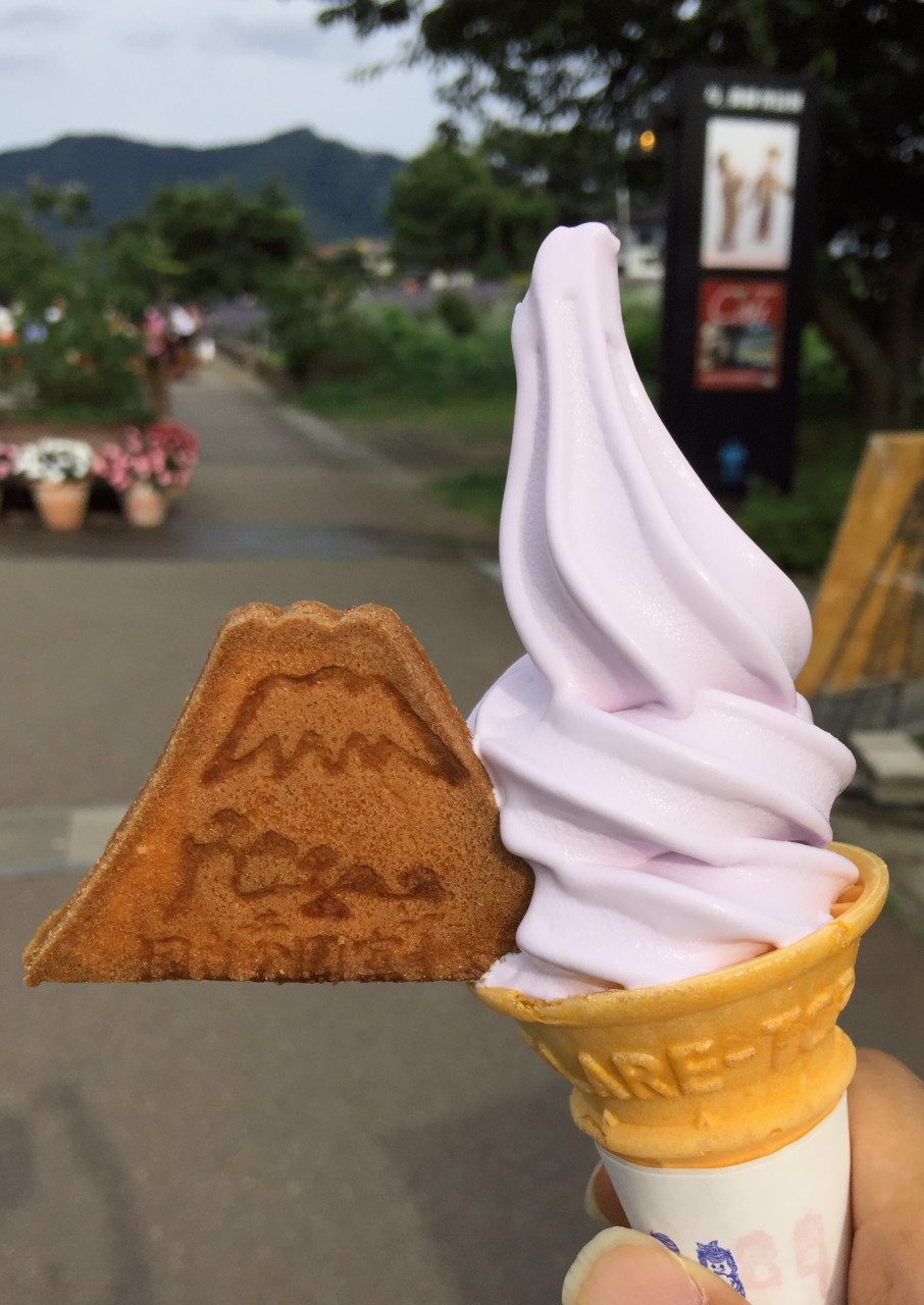 八木崎公園にも立ち寄りました。こちらもラベンダーは大石公園以上に見事ですが、富士山との絡みはあまり撮れません。ざっと見て帰る前にソフトクリーム(ラベンダー)を買ったら、富士山が付いてきました。