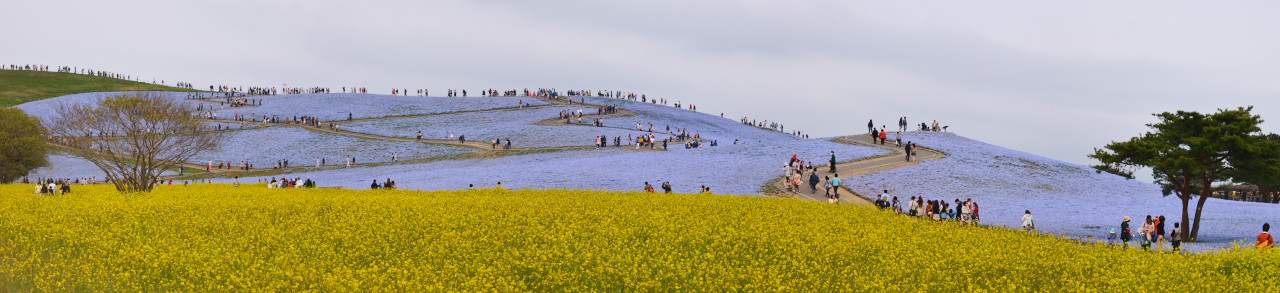 ここはネモフィラが大変有名ですので、手前の菜の花を含めてパノラマにしてみました。なお、青空がのぞめなかったのは残念でした。