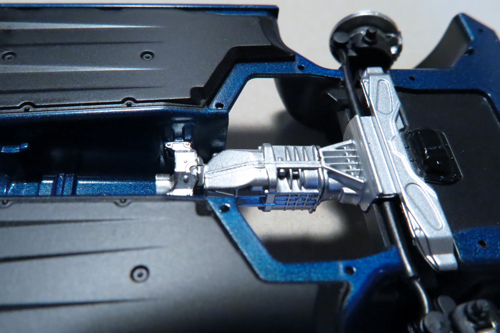 色々と小技を聞かせて自己満足しながら、プロペラシャフト、排気管とマフラー、リアサスメンバー等を組み付けました。